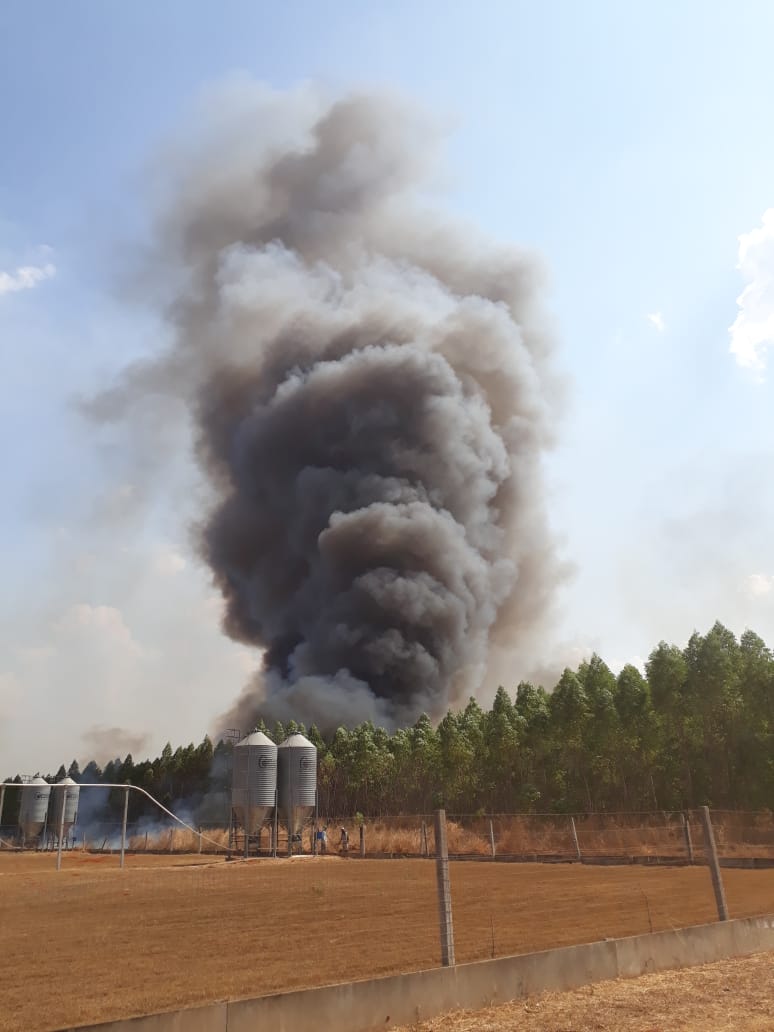 O fogo começou, esta manhã, em uma área de floresta, próxima a um frigorífico. As chamas se alastraram e foram em direção a algumas residências e três granjas da empresa.