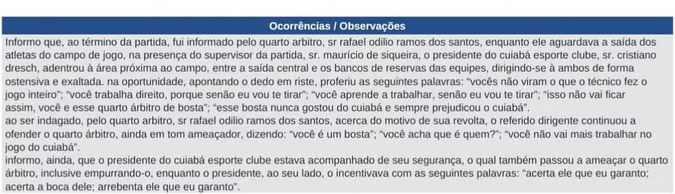 “Você aprende a trabalhar, senão eu vou te tirar. Isso não vai ficar assim, você e esse quarto árbitro de bosta”, consta no documento. O relatório ainda aponta que o presidente estava acompanhado de um segurança, durante a abordagem, e houve incentivo à agressão contra o profissional que atuava como quarto árbitro. “Acerta ele que eu garanto, acerta a boca dele. Arrebenta, ele que eu garanto”.