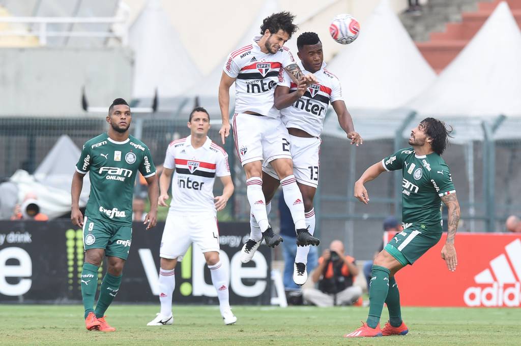 O Jogo – O primeiro tempo do Choque-Rei foi muito disputado, com entradas duras dos dois lados e cinco cartões amarelos. O Palmeiras trocou muitos passes, mas não conseguiu ameaçar o gol de Volpi. O São Paulo chegou um pouco mais ao ataque, mas também não teve grandes chances.