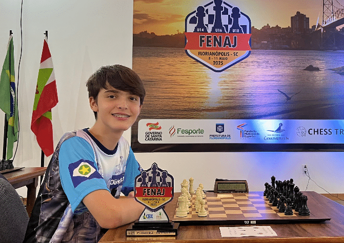 Olavo Oliveira, de 14 anos, que já conta com um histórico de múltiplas conquistas no xadrez, chega a 12 pódios nacionais entre Brasileiro Escolar e FENAC/FENAJ. Ele também detém 3 pódios internacionais, entre Sul-Americano Escolar e Festival Sul-Americano da Juventude.