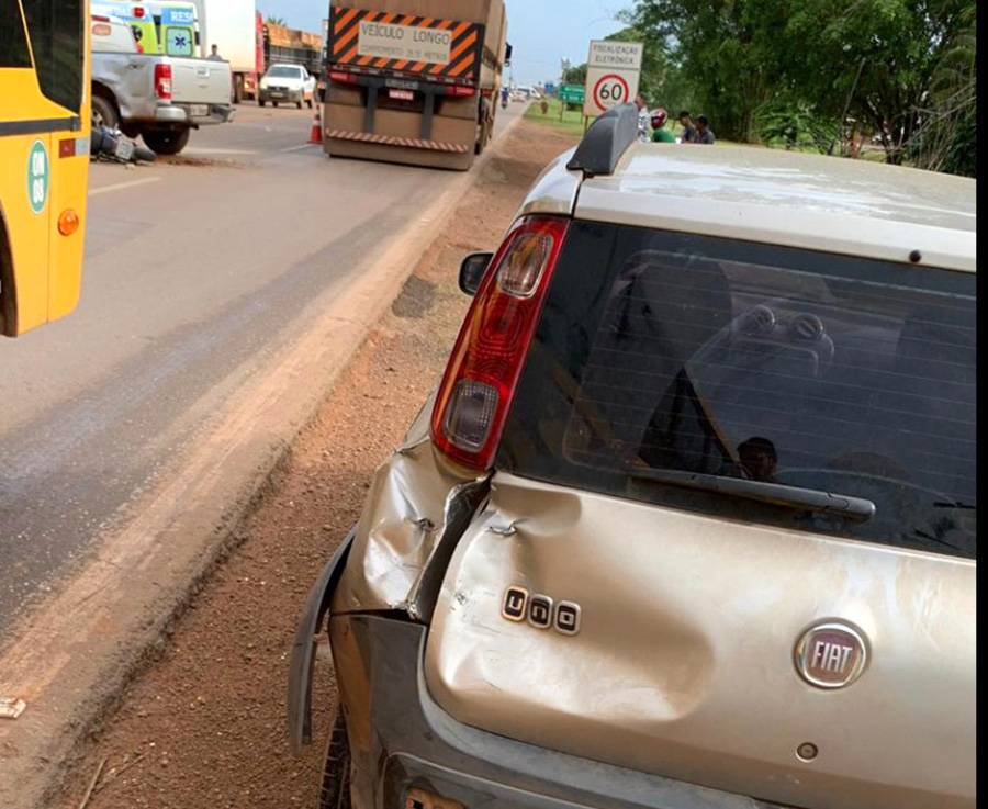 De acordo com informações do policial rodoviário federal, Antônio Barbosa, a caminhonete estava fora da rodovia e a colisão ocorreu após ela “cruzar a via para mudar o sentido de trafegabilidade. No local, existem placas que proíbem esse tipo de ação dos motoristas. Enquanto ela executava essa manobra foi atingida pelas duas motos. Os dois ficaram feridos e um com uma certa gravidade. Na sequência, o Uno freou para evitar a colisão com os três já acidentados e foi atingido pelo Compass que estava poucos metros atrás”.