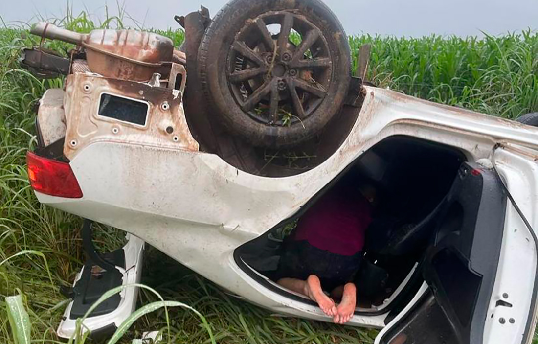 Devido o capotamento, o carro parou em uma região de vegetação alta, próximo a uma plantação de milho e ficou bastante danificado, parando com as rodas suspensas no ar.