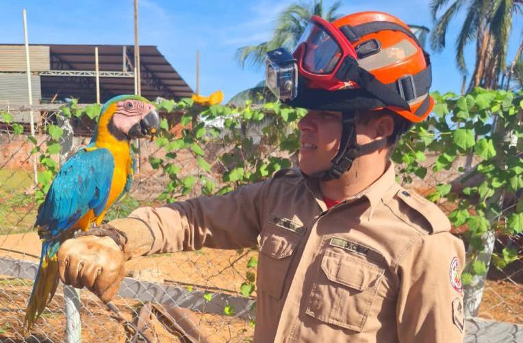 Já em Tangará da Serra, na segunda, a 3ª Companhia Independente de Bombeiros Militar capturou a arara-canindé em uma residência. A ave tinha ficado presa em uma cerca por dois dias e não conseguia voar. Ela foi retirada do local com o uso de luvas, garantindo a segurança durante o resgate.
