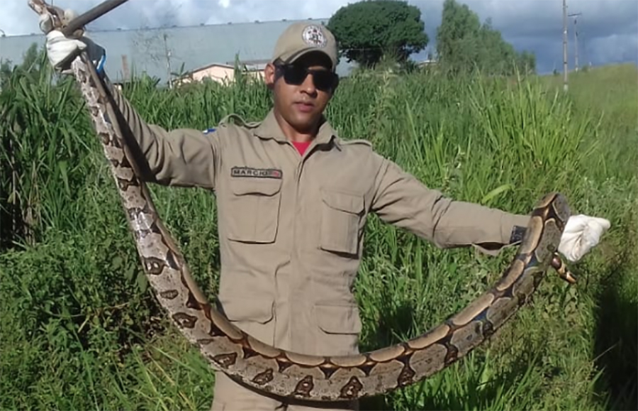 O Copo de Bombeiros capturou uma jiboia com 2,30 metros em uma residência, na rua Chico Xavier, no bairro Palmiteiro, em Juína (733 quilômetros de Cuiabá), no último final de semana. De acordo com informações de uma soldado, ao lado do imóvel existe uma região de mata e brejo.