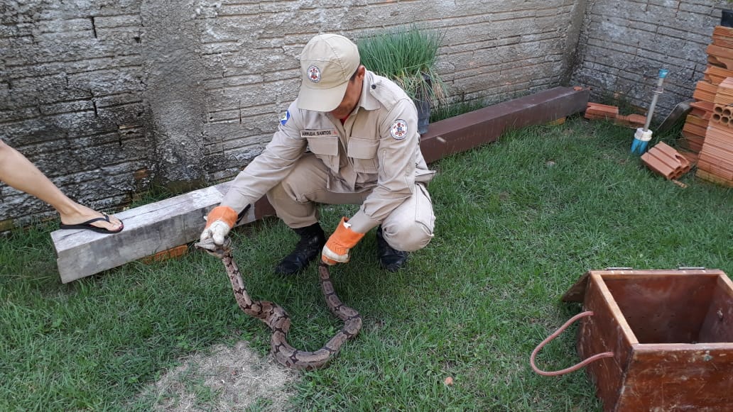 Os militares do Corpo de Bombeiros capturaram uma jiboia, de aproximadamente 1,8 metro, escondida atrás de um balde com plantio de cebolinha, em uma residência, no bairro São Francisco, ontem.  “A dona da casa nos relatou que estava limpando cebolinha quando avistou o animal atrás do vaso. O animal aparentava aspecto saudável já foi solta fora da área de preservação”, disse sargento dos bombeiros, Pedro Ribas Alves.
