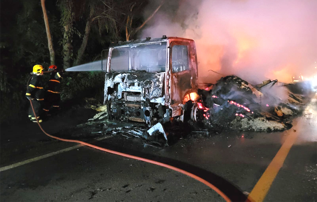 De acordo com o registro dos bombeiros, o caminhão transportava farelo milho e estava tomado pelo fogo. A equipe realizou combate direto às chamas, que durou aproximadamente 5 horas, contando com apoio da Polícia Rodoviária Federal no controle do trânsito.