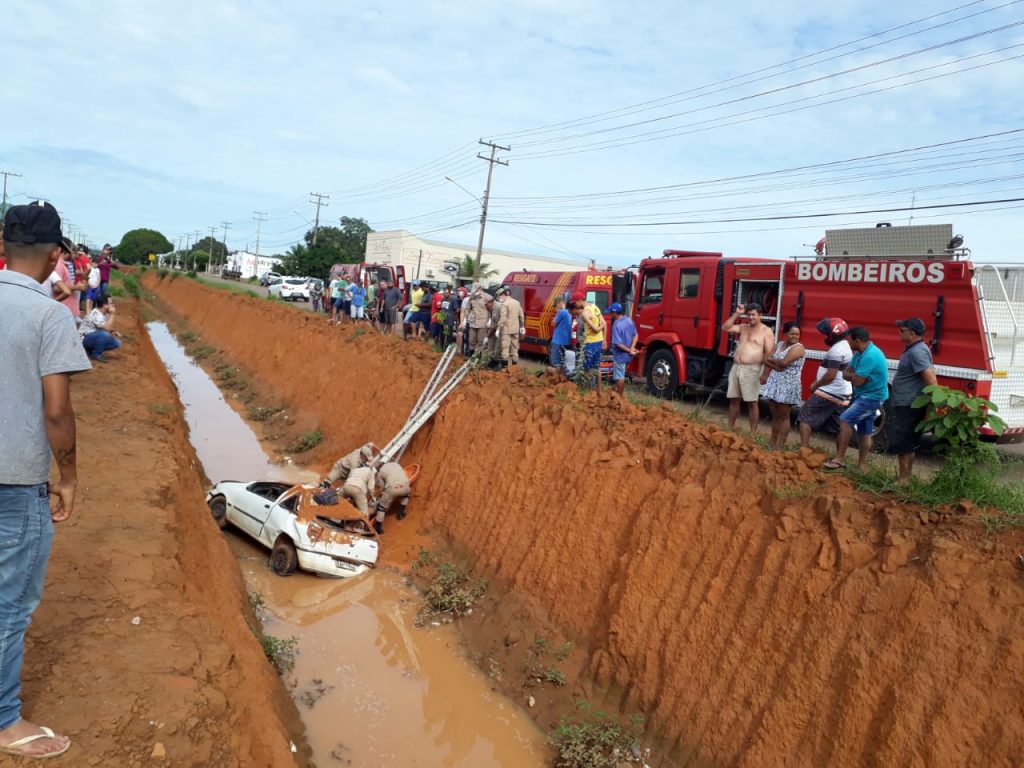 O carro ficou completamente danificado e foi retirado da valeta com auxílio de um guincho.
