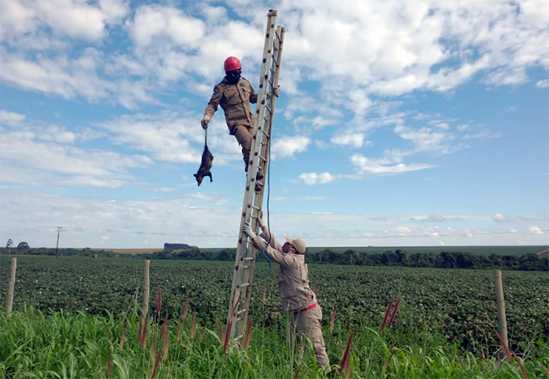 Bombeiros resgatam gambá preso na fiação da rede de telefonia em Mato Grosso