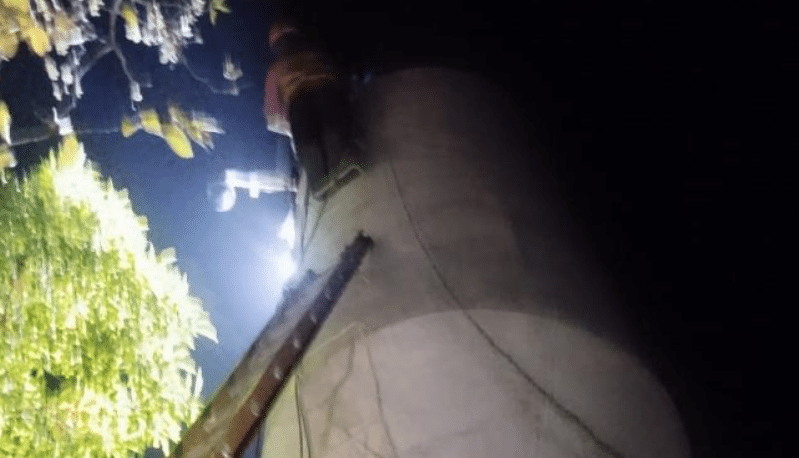 Uma escada de dois lances foi ancorada na caixa-d’água, e um dos bombeiros subiu e fez uma amarração de segurança para içar a vítima. Durante o processo de descida, os bombeiros incentivaram o homem a se comunicar e se orientar. No entanto, a vítima não conseguia falar e acabou desmaiando.