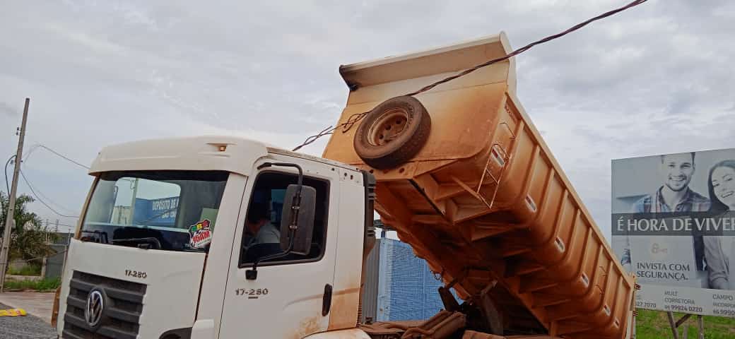 Um caminhão caçamba atingiu, hoje, os fios da rede elétrica no bairro Residencial Buritis. O motorista ficou no interior do veículo e foi retirado pelo Corpo de Bombeiros.