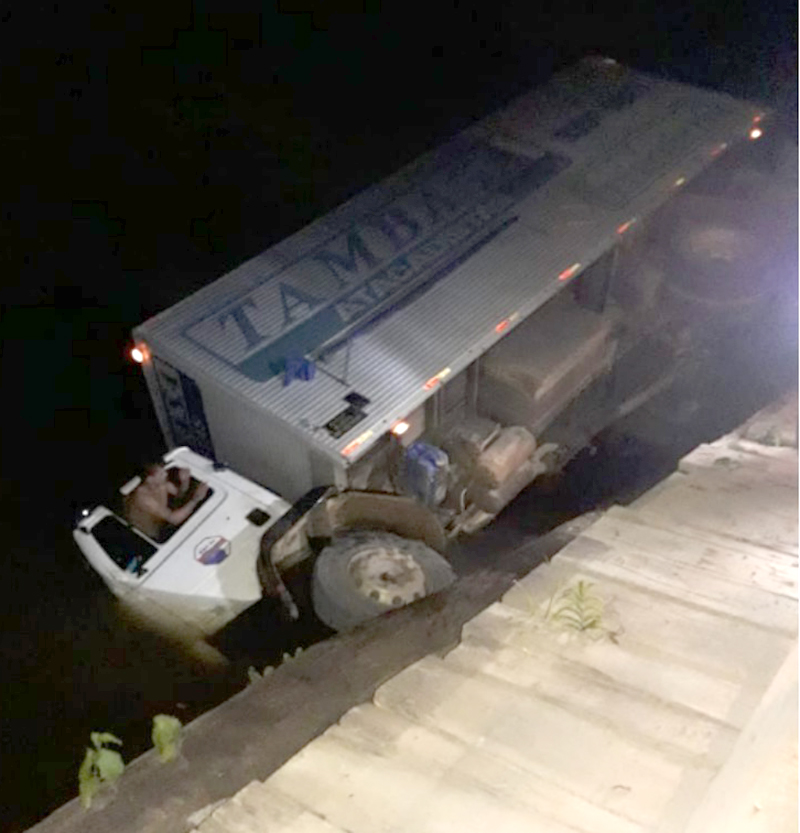 O caminhão caiu quando passava pela cabeceira da ponte e a cabine ficou totalmente encoberta pela água. A empresa proprietária informou que a retirada já foi feita e o prejuízo ainda está sendo contabilizado.