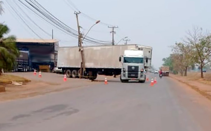 O VW 370 cinza, com placas de Juína, colidiu, esta manhã, com um poste na rua João Pedro Moreira de Carvalho, na lateral da rodovia federal. O motorista não ficou ferido e assinou termo de recusa de encaminhamento médico. A versão investigada inicialmente é que o caminhão baú se chocou com o poste enquanto saia do pátio de um posto. A pista no sentido norte ficou interditada até a remoção do veículo.