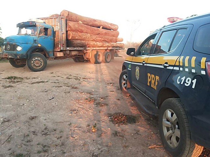 Caminhão com toras abandonado durante fiscalização da PRF (divulgação)