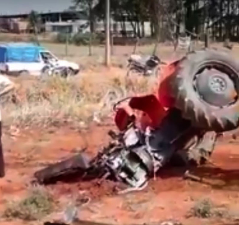 Não foi informado o que provocou o tombamento. O caminhão parou com as rodas para cima às margens da rodovia. A cabine ficou bastante danificada. O veículo estava carregado com um trator que partiu ao meio e ficou destruído.