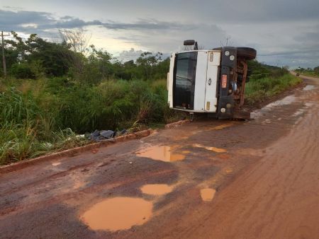 O caminhão Ford branco, tombou na BR-158 em Vila Rica (1,2 mil km de Cuiabá), ontem. O motorista que não teve a identidade divulgada, sofreu escoriações, mas passa bem. A versão apurada é que ele perdeu o controle da direção e o caminhão tombou às margens da rodovia. Não foi informado para onde o motorista estava seguindo viagem.