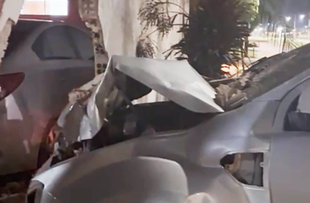 Imagens de câmera de segurança e de redes sociais mostraram o momento em que o veículo, em alta velocidade, “rampa” a rotatória. Parte do muro foi derrubada e um portão caiu sobre um carro que estava na garagem da casa. Com o impacto, a parte da frente da Ranger teve danos consideráveis.