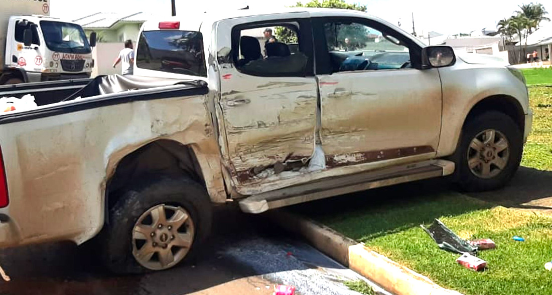 Com o impacto, a S-10 rodou subiu parou na calçada. Parte da lateral ficou amassada, um dos vidros quebrou e um pneu estourou. O caminhão, baú, que pertence a uma empresa, ficou com o para-choque quebrado, parte da cabine amassada e para brisa quebrado.