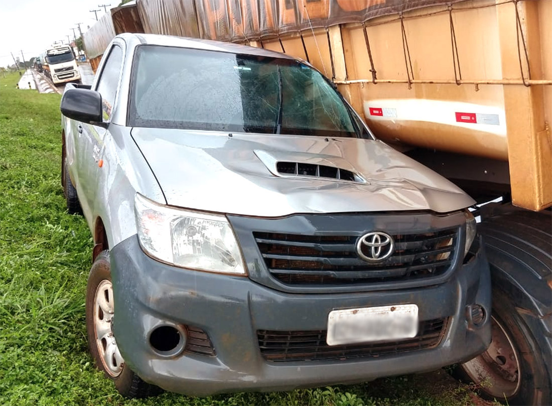 A colisão envolvendo uma Toyota Hilux prata, com placas de Sorriso, e uma Volvo FH 540, com placas de Rondonópolis, ocorreu no quilômetro 597 (nas proximidades da rodoviária), na BR-163, ontem à tarde, em Nova Mutum. De acordo com informações da concessionária que administra a rodovia, não houve feridos.