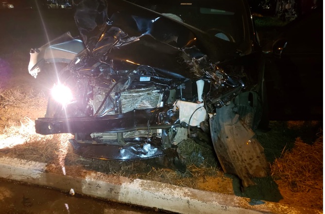 A colisão foi tão violenta que a parte frontal do Etios ficou bastante danificada e a caminhonete tombou às margens da pista.