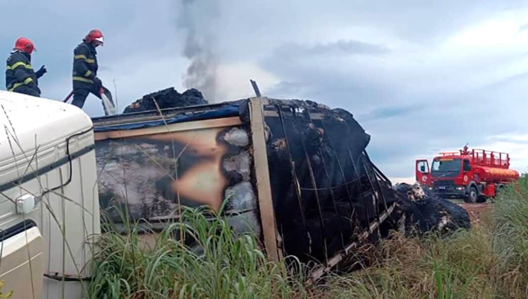 Carreta carregada com algodão tomba e pega fogo em Mato Grosso