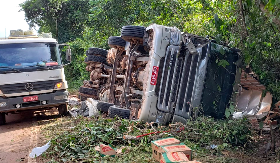 Um caminhão Scania cinza, modelo P310, placas de Guarantã do Norte, que estava carregado com várias toneladas de garrafas de óleo de soja e outros alimentos tombou às margens da rodovia, a cerca de 40 km de Sinop sentido Itaúba. O carreteiro não teria ficado ferido.