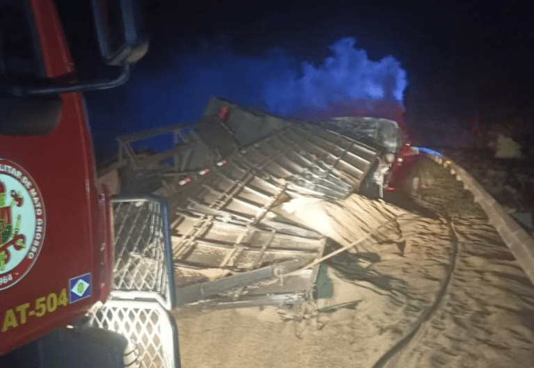 A carreta estava carregada com carga de arroz, que ficou espalhada pela via, impedindo o fluxo de veículos, além de focos de incêndio na cabine. Os militares removeram a carreta, realizaram a limpeza dos resíduos e eliminaram pequenos focos de incêndio, enquanto a pista permanecia parcialmente interditada. A vítima recebeu os primeiros socorros do Samu no local.