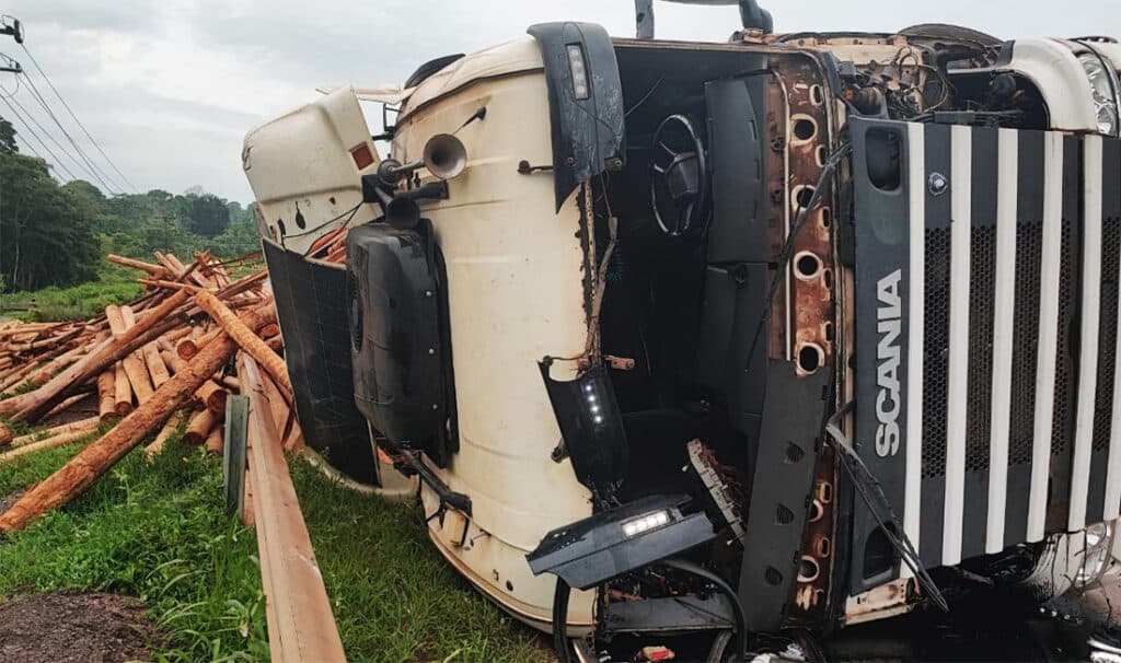 O condutor relatou à equipe operacional que “a carreta seguia no sentido norte quando a barra de direção apresentou pane, ocasionando a perda do controle direcional”. Na sequência, acabou tombando próximo às margens. O veículo realizava o transporte de toras de madeira e parte do carregamento se espalhou pelo acostamento.