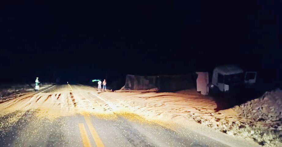 Houve também a queda de um poste no local, segundo informou a empresa. A carga de milho ficou sobre a pista, onde foi realizado limpeza e liberação da pista.