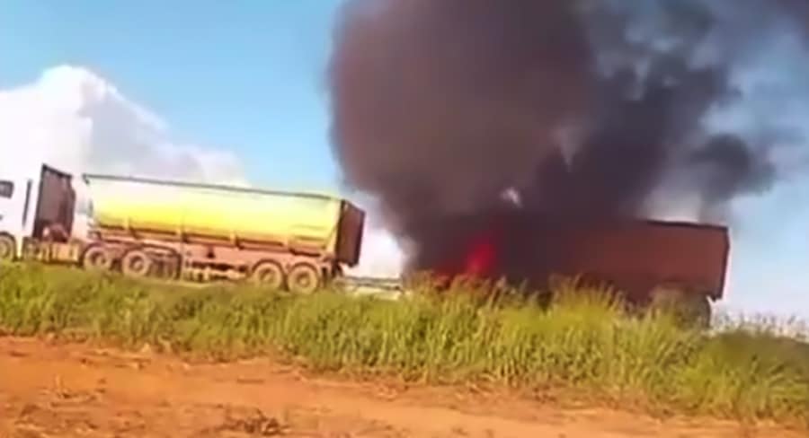 Uma carreta MAN 480 branca, com placas de Sinop, teve um de seus semirreboques parcialmente consumido pelas chamas, ontem à tarde, no quilômetro 715 da rodovia federal em Sorriso. A concessionária da rodovia confirmou que não houve registro de feridos.