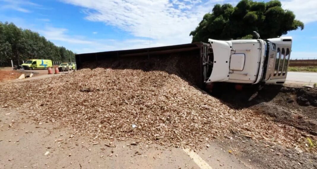 O veículo estava carregado de cavaco e parte da carga se espalhou.