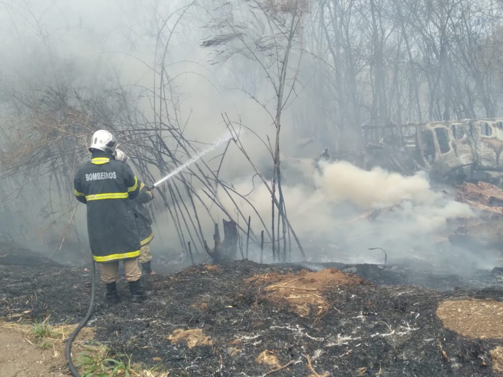 Os bombeiros foram até o local e encontraram a carreta já tombada e em chamas. O fogo também atingiu a vegetação às margens da rodovia. A equipe composta por três bombeiros isolou a área e iniciou o combate ao incêndio.