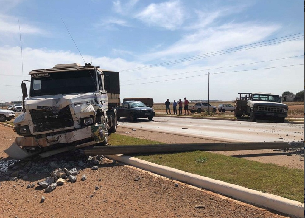 Carreta derruba poste, atinge caminhonete e três ficam feridos em MT