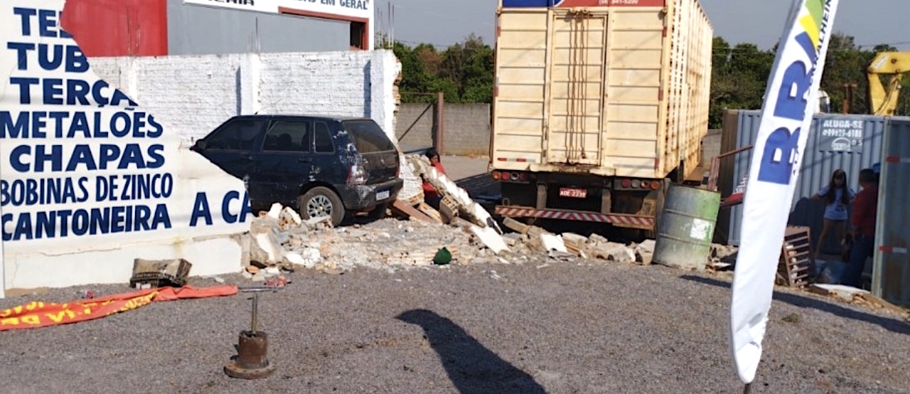 O acidente foi ontem por volta das 14 horas, em Colíder, às margens da rodovia 320. A carreta FH Volvo boiadeira acabou batendo em um muro, de duas empresas (uma que fabrica grades, portões e outra que comercializa telhas), e atingiu um Fiat Uno prreto, que estava estacionado, e foi atingido por parte do muro. Ninguém se feriu.