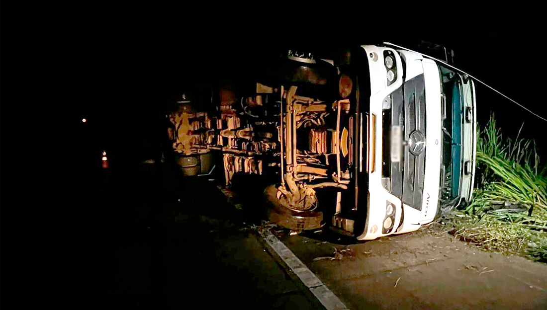 O tombamento envolvendo a Mercedes-Benz Atego 2426 branca, com placas de Mandaguaçu (PR), foi registrado ontem, no fim da tarde, no início da Serra do São Vicente, em Santo Antônio do Leverger. O motorista não se feriu e assinou termo de recusa de atendimento médico.