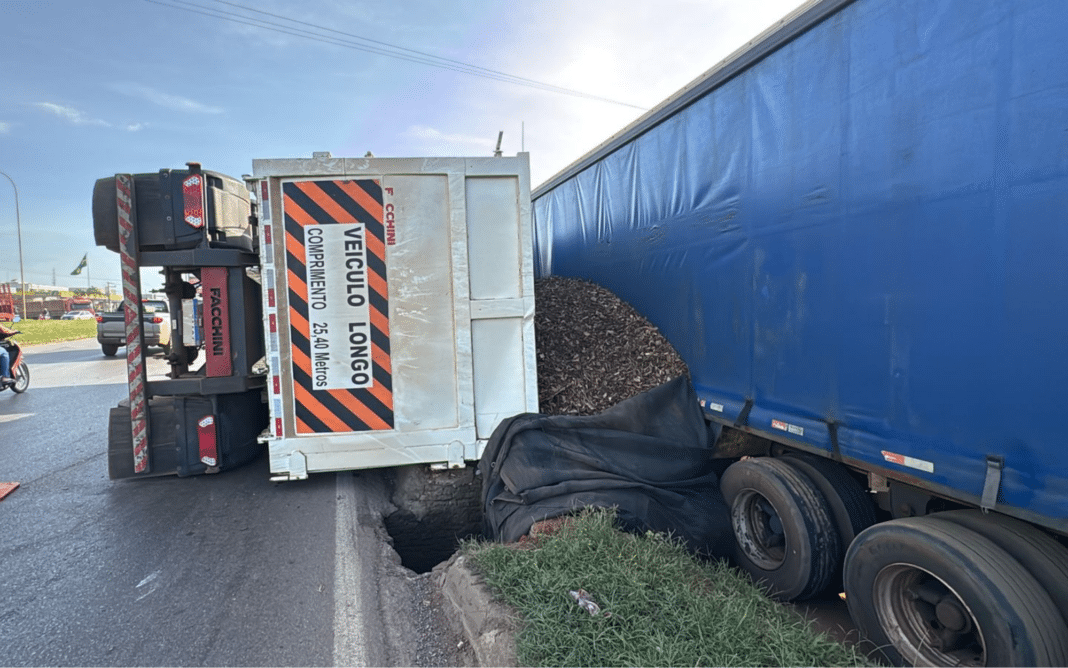 Carreta tomba e derrama madeira sobre a pista da BR-163 em Sorriso