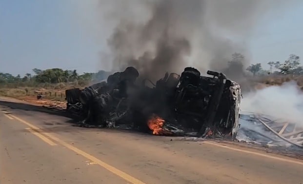 A versão preliminar investigada é que o condutor da carreta carregada de madeira acabou perdendo o controle da direção em uma curva e tombou. Em seguida, o veículo acabou pegando fogo.