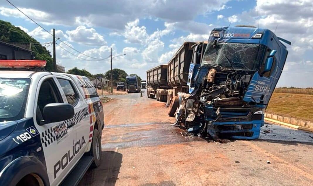 O acidente envolvendo uma carreta Scania graneleira azul e outra boiadeira foi, hoje, na MT-010, perímetro urbano de Ipiranga do Norte (115 km de Sinop). O motorista do veículo azul não teve ferimentos graves e conseguiu sair sozinho da cabine. O outro motorista não se feriu.