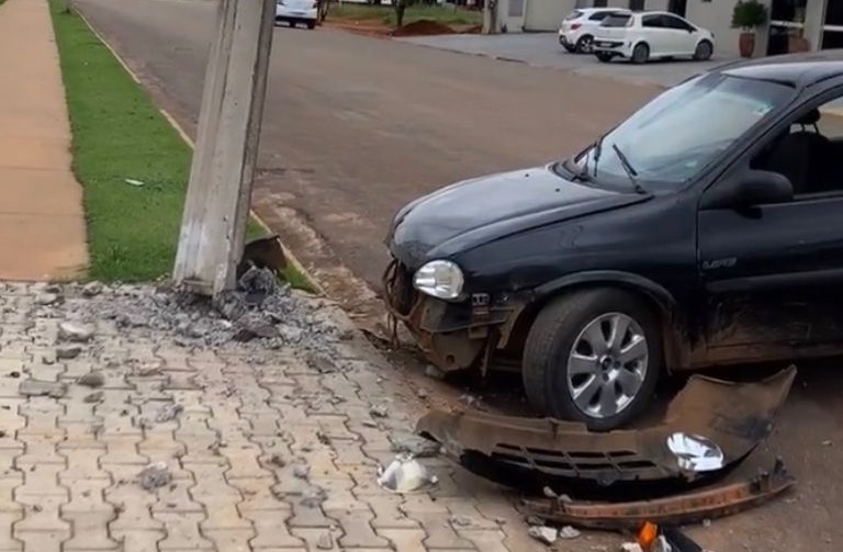 Um GM Corsa preto bateu e quebrou um poste da rede de energia elétrica, a avenida Goiás, nas proximidades da rodoviária, na região central de Lucas do Rio Verde, hoje de madrugada.