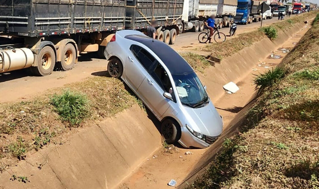 De acordo com a assessoria da concessionária, ambos seguiam sentido Industrial 2ª Etapa, próximo ao local onde há uma obra na pista sendo realizada, quando houve colisão lateral entre carreta e o carro, que caiu na vala de escoamento de água.