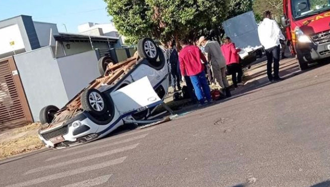 O Renault Sandero branco capotou, há pouco, após colisão com um VW Gol prata, no cruzamento das ruas Roma e Bolonha, no bairro Jardim Itália. Uma pessoa sofreu escoriações e foi encaminhada ao hospital regional. Não há detalhes sobre o atual estado de saúde.