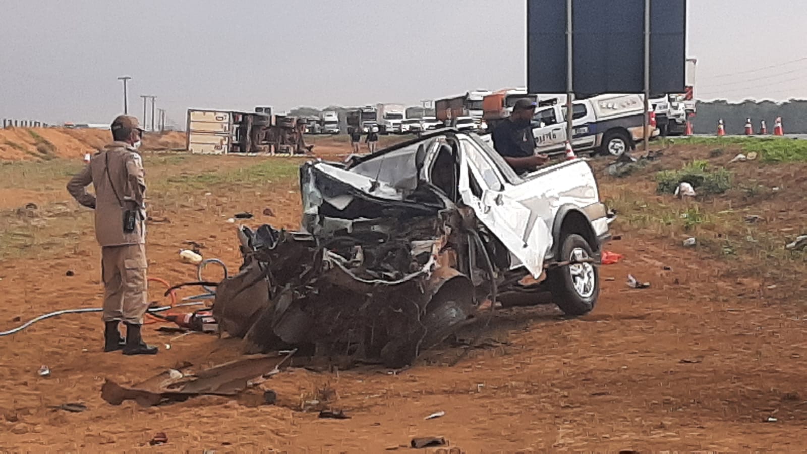 A carreta que estaria carregada com carne, saiu da rodovia e tombou de lado. Já a Strada também ficou fora da pista e completamente destruída.