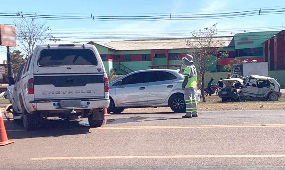 Carro fica com lateral destruída em acidente com caminhonete na 163 em Sinop; 3 são levados ao hospital