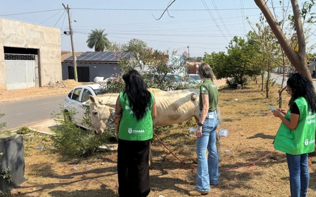A equipe da prefeitura resgatou, hoje, um cavalo vítima de maus-tratos no bairro Três Barras, em Cuiabá. O animal foi encontrado em um canteiro da via, visivelmente abandonado. Ele estava debilitado e apresentava marcas que indicam possível agressão com chicote.