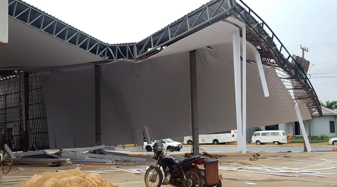A tão esperada chuva moderada está caindo no centro e em alguns bairros de Sorriso acabando com o forte ‘calorão’ -a máxima hoje chegou a 39º-. Esta é a primeira chuva após o período de estiagem. Em alguns locais ventou forte. Parte da estrutura de um posto combustível que está sendo construído na avenida Brasil, no centro, acabou sendo atingida e ficou retorcida.