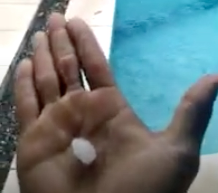 Quem estava em casa, aproveitou para registrar o granizo que caia junto com a água. Um dos moradores filmou o gelo enquanto caia na piscina de sua residência.