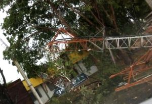 Uma torre de transmissão de uma emissora de TV local, localizada na avenida dos Flamboyants, não resistiu aos fortes ventos e a chuva, esta tarde, na cidade, e caiu. Parte da estrutura metálica ficou no pátio da Mitra Diocesana e outra na avenida dos Flamboyants deixando tráfego interditado. Não houve feridos. Na avenida Julio Campos a fachada de uma loja de roupa -que estava fixada na parede, de alvenaria- caiu na calçada. Ninguém teria sido atingido.