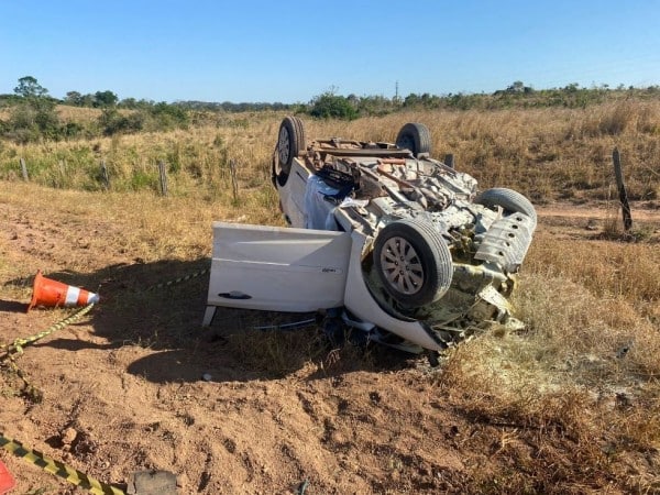 A caminhonete ficou com a parte frontal totalmente destruída. Já o HB20 acabou capotando às margens da rodovia.