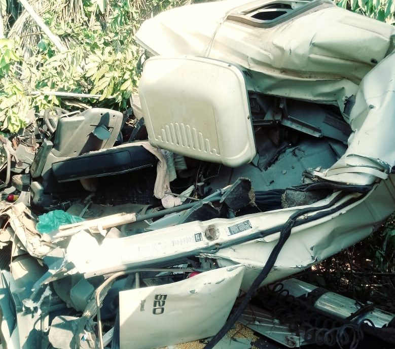 A cabine da Volvo ficou completamente destruída. Já a Daf teve apenas danos no vagão.