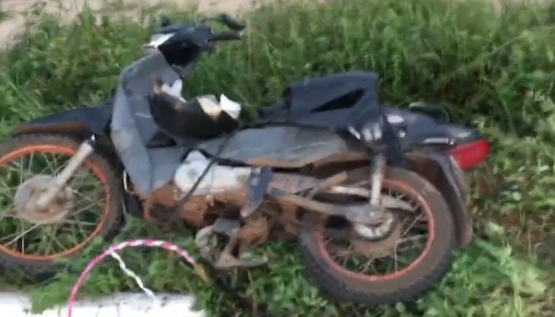 A motocicleta ficou completamente danificada. Já a caminhonete teve danos na parte da frente.