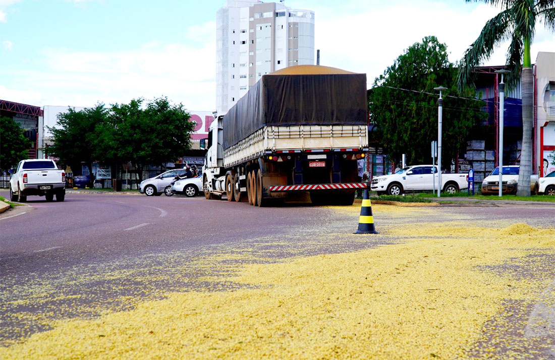 A Guarda Municipal de Trânsito fez a sinalização e acompanha a retirada da soja da pista. A carreta está estacionada no cruzamento das avenidas Itaúbas e Tarumãs.